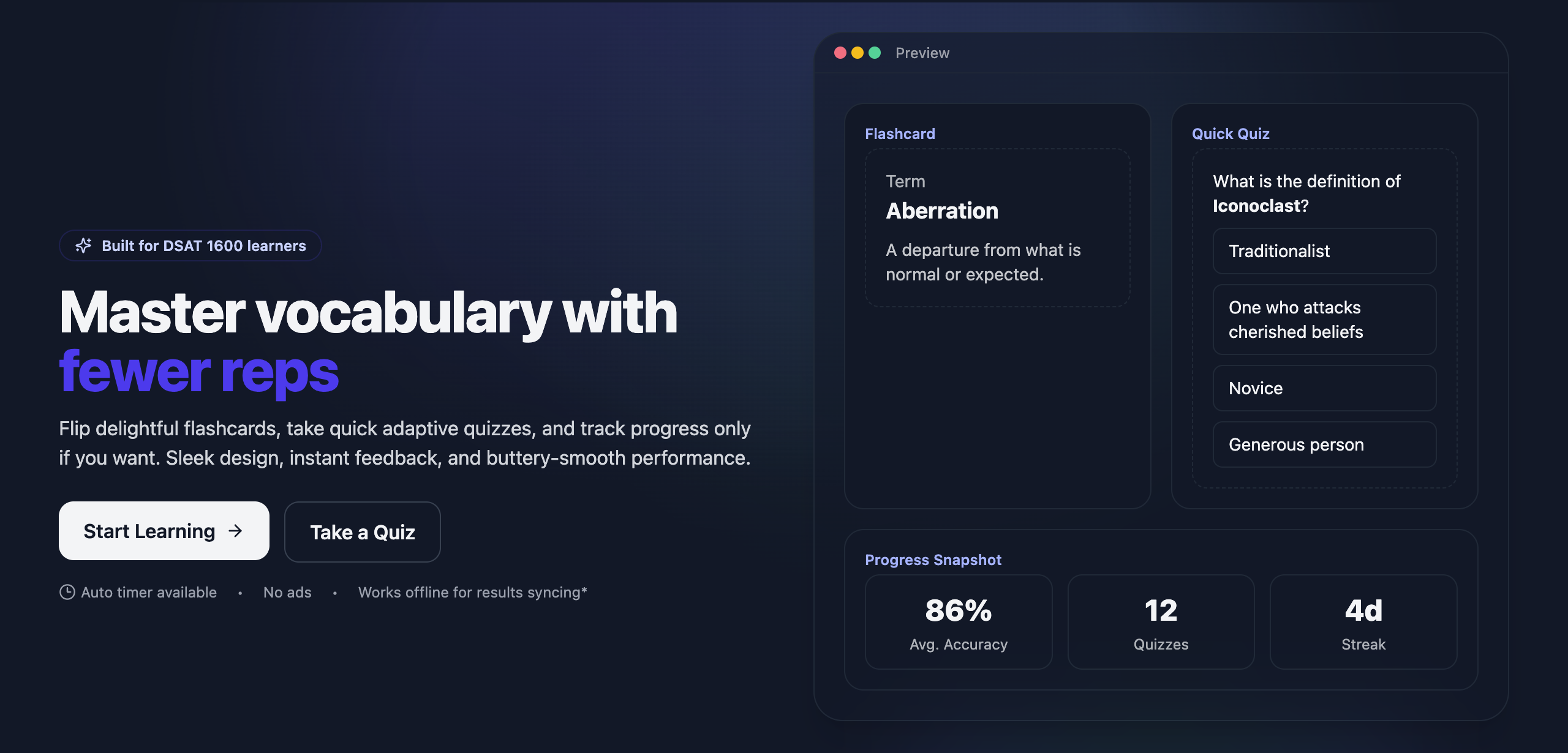 In FieldSAT preparation platform that pairs vocab flashcards, adaptive quizzes, and offline tracking so teens can self-study anywhere.